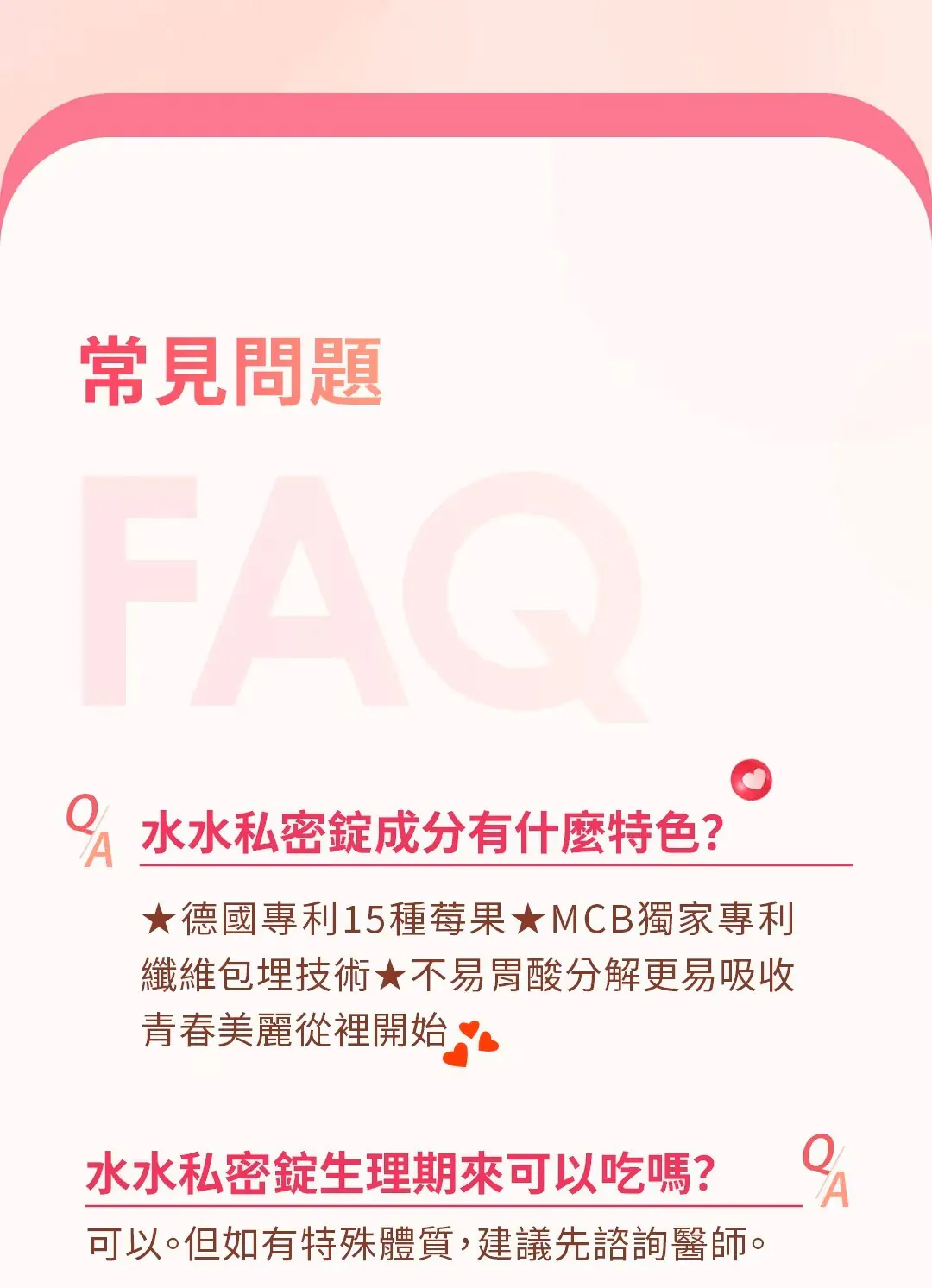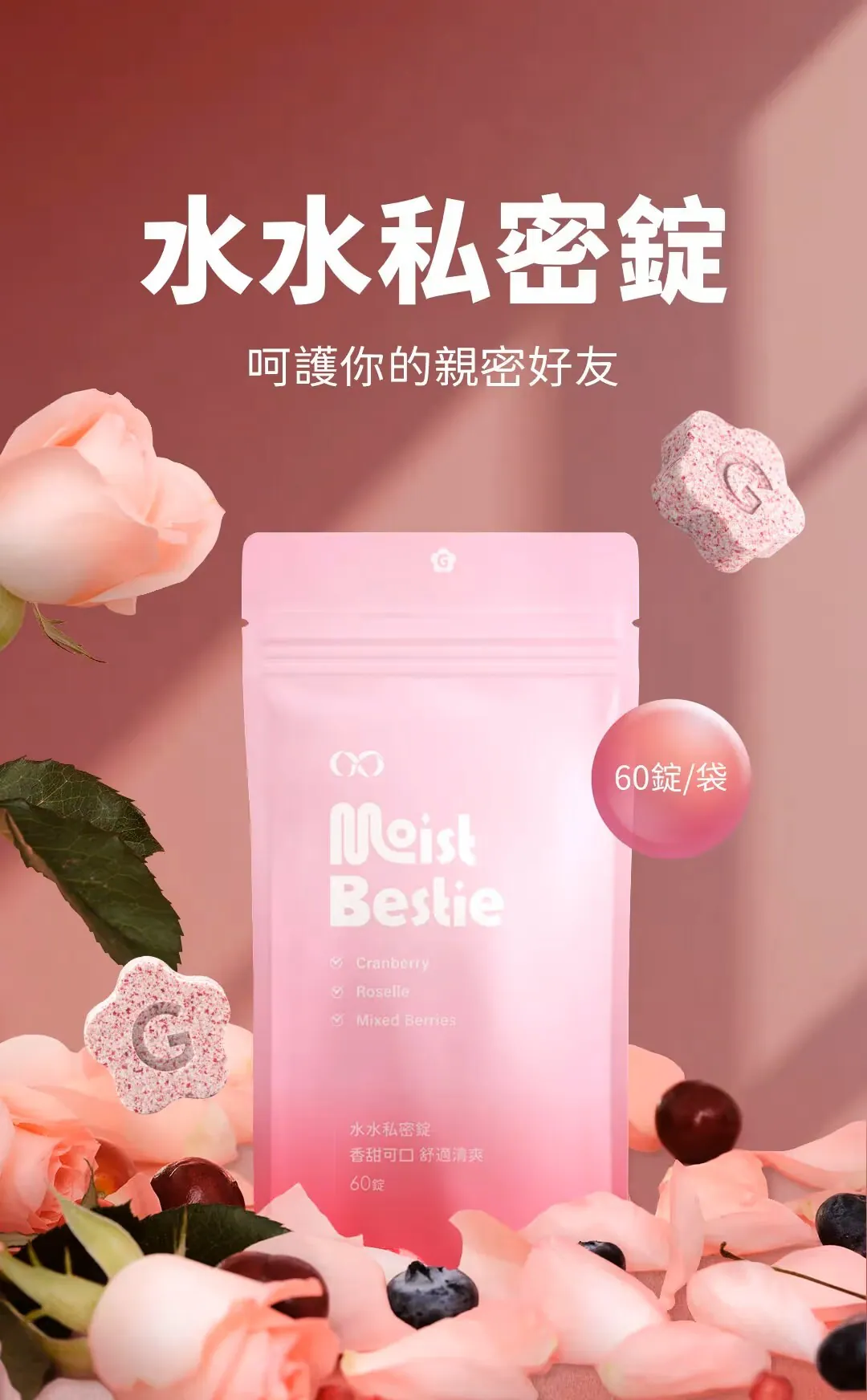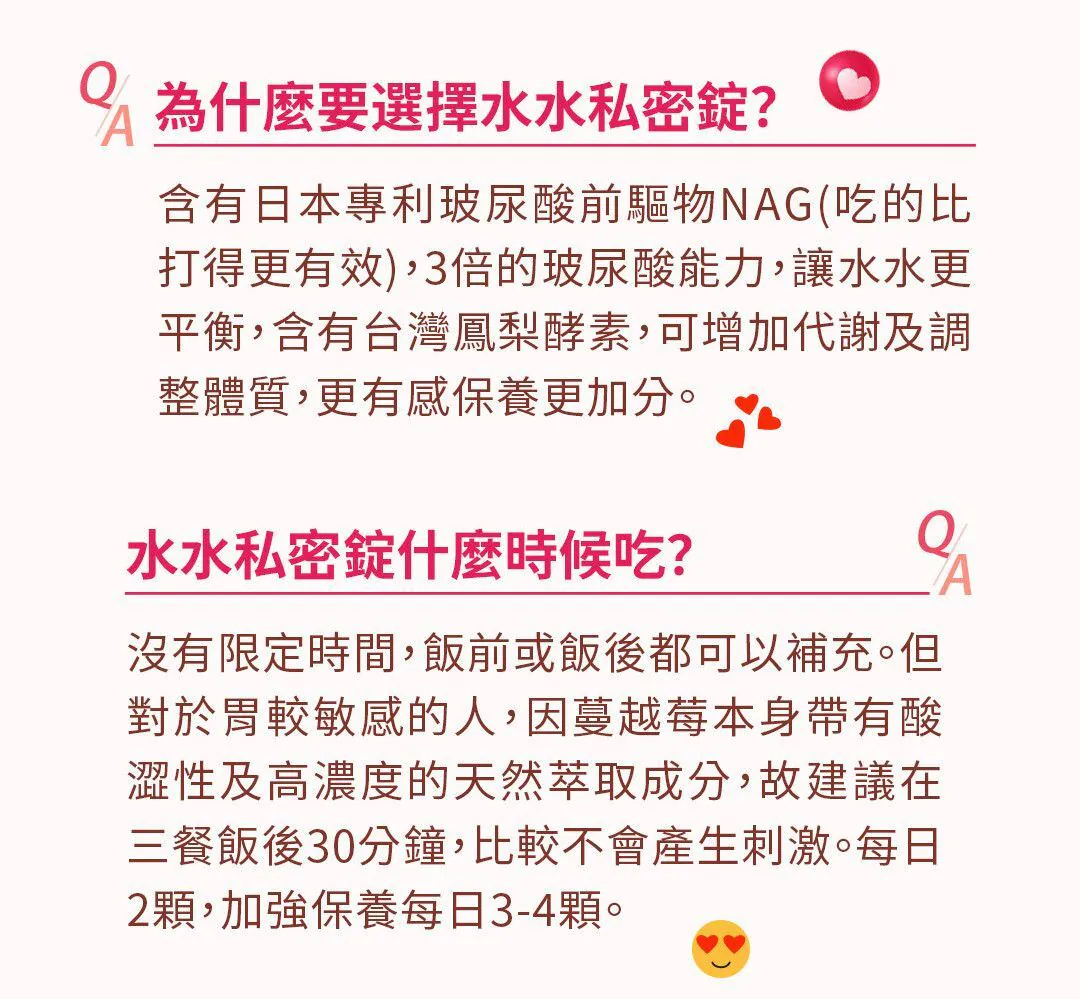 1天2顆水水錠(50張國際專利配方),成為你的呵護關鍵,打造你的親密好友。水水私密錠結合多種天然萃取與玻尿酸前驅物 NAG,針對女性的健康由內調理、不靠人工香精,打造溫和但有感的保養方式: