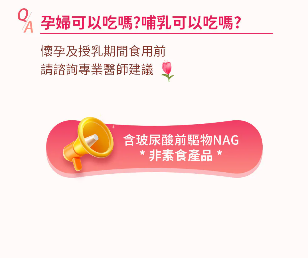 - 玻尿酸前驅物 NAG:超過玻尿酸3倍,加倍養顏美容。
