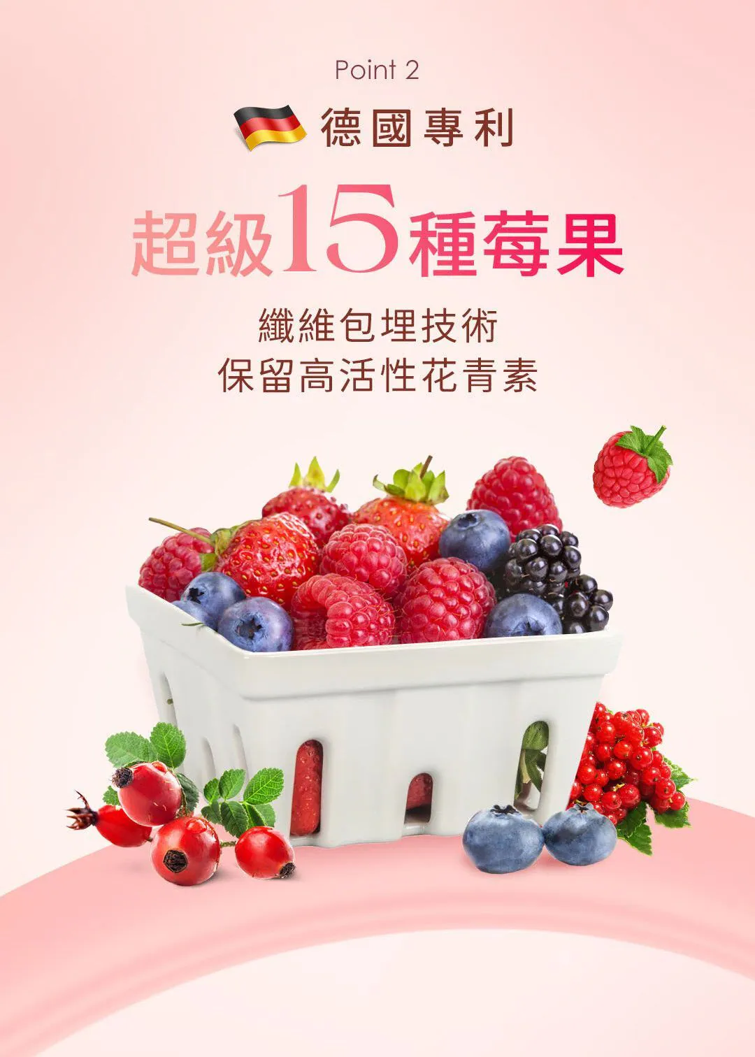 - 德國專利15種莓果:纖維包埋技術,保留高活性花青素。